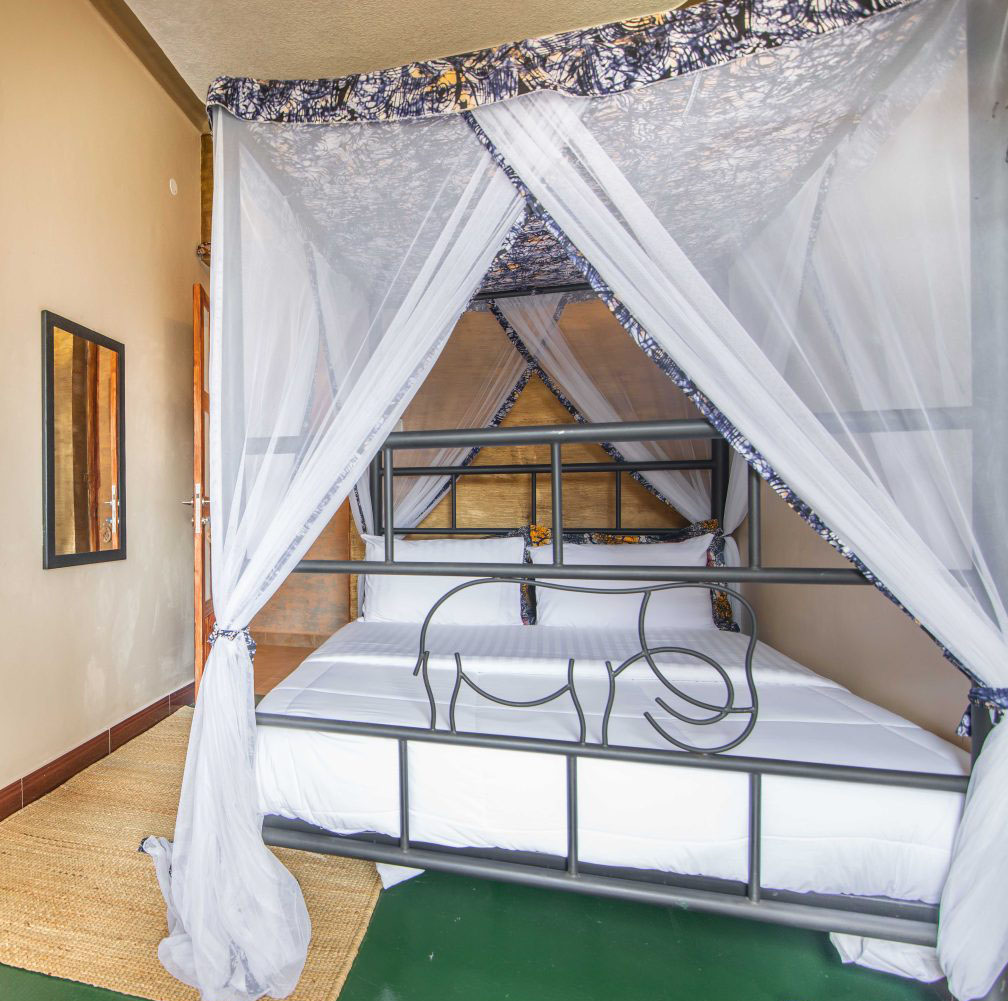 PREMIER DOUBLE ROOMS at Jet Villas Entebbe ( JVE ) have the Luxury of a ONE bed size of 7x 7 Feet – the over queen sized Bed, with High Canopy Mosquito Net. All Rooms have a unique touch of a true African design in both finishing and furnishings – depicting the rich African cultures and traditions, and a fabric art paint on the walls that is unique to each room. This Room prouds a large airy Front door that is mosquito proofed by a gauze that lets air in and out 24/7 naturally letting in the Lake and Swamp Breeze through your balcony and Rooms that are facing the Lunyo Swamp, with this Natural setting you may need any electronic air conditioner… Occupancy Max: One as a Single and Two as a Double.