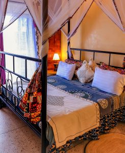 OUR STANDARD DOUBLE ROOM at Jet Villas Entebbe ( JVE ) have the Luxury of a TWO beds size of 4x 5 Feet with High Canopy Mosquito Net. All Rooms have a unique touch of a true African design in both finishing and furnishings – depicting the rich African cultures and traditions, and a fabric art paint on the walls that is unique to each room. This Room has a large area Occupancy Max: One as a Single and Two as a Double.